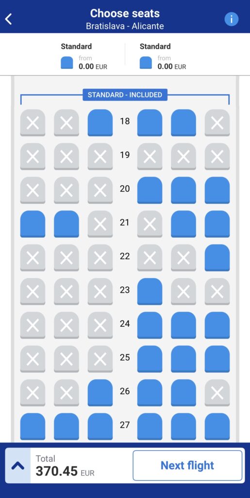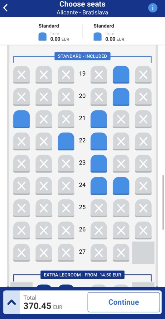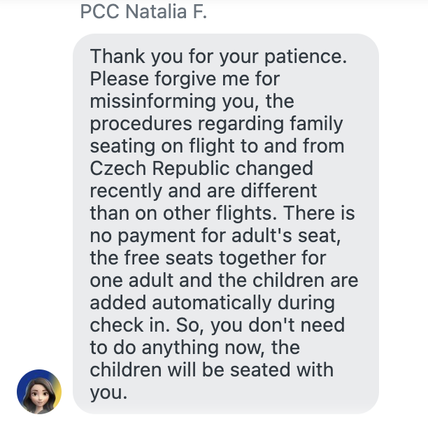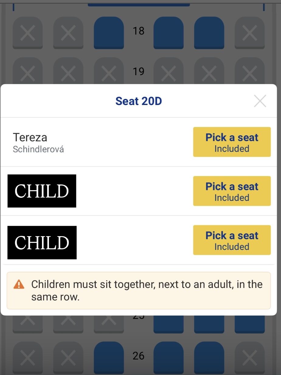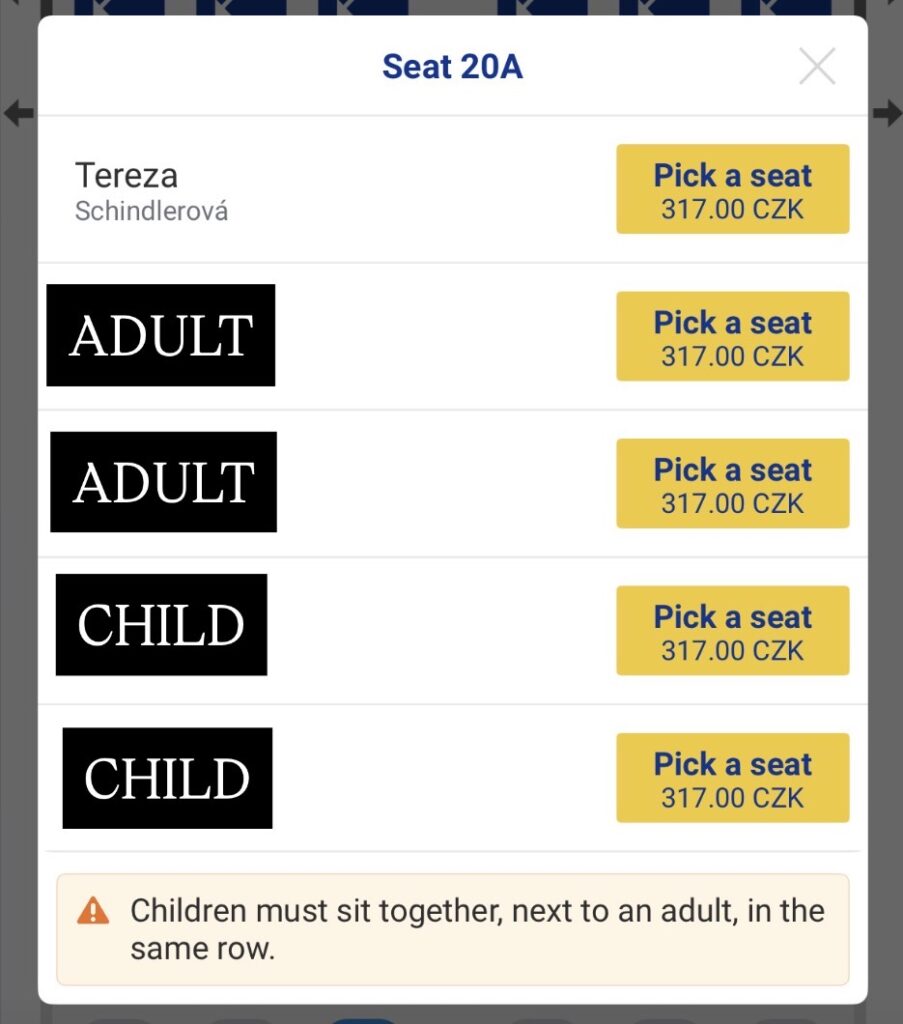 Můžete si vybrat sedadla v řadách 18-33 pro jednoho dospělého a až 4 děti. Pokud tam nebudou místa, tak by vám měli dát sedadla jinde. Pak mi na mail přišla žádost o úhradu 400 Kč, kterou jsem zaplatila v appce a bylo. Ostatní dospělí na rezervaci dostanou náhodné sedadlo při check-inu nebo jim lze dodatečně sedadla přikoupit.