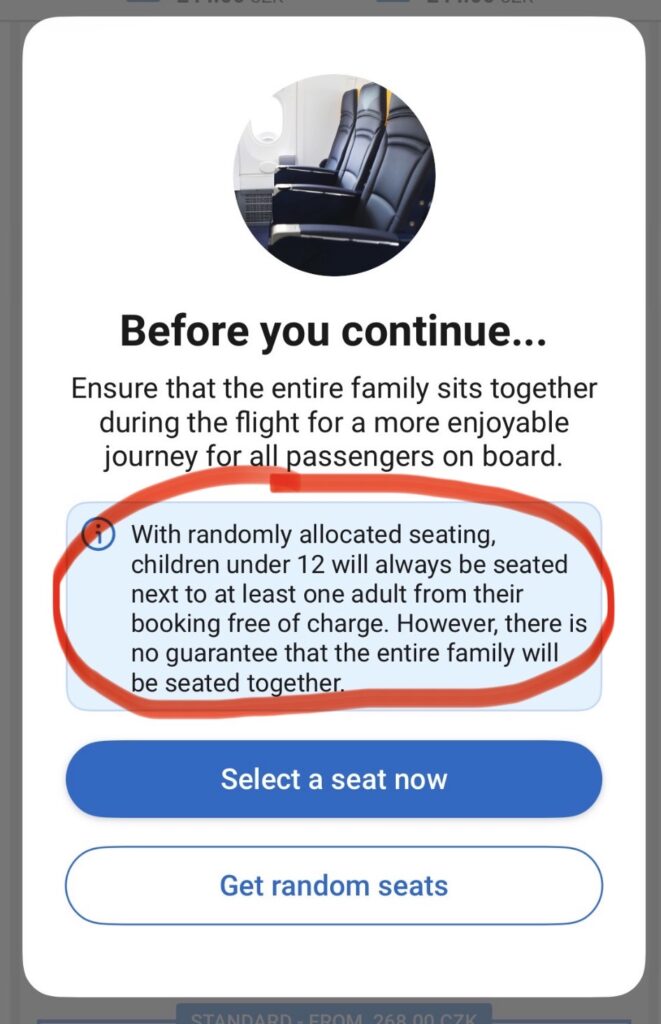 Stačí sedadla nevybírat a kliknout na Continue without a seat nebo náhodné přidělení (random seat allocation) jako v předchozí možnosti. Dokončíte nákup letenek a posléze napíšete na chat (čekací doba obvykle 10-20 min), že chcete sedět s dětmi a přiřadit jim sedadla. Budou po vás chtít těch 8 eur za jeden směr, celkem tedy 400 CZK.