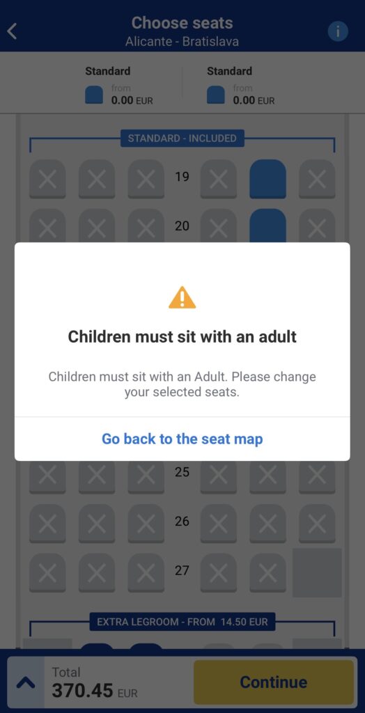 U některých letů – dle zákaznické podpory Ryanairu je to u letů z/do ČR, Itálie a Nizozemí, nemáte možnost naklikat si sedadlo za 8 EUR a k tomu dětská sedadla zdarma vůbec. Ukazuje to pouze možnost klasického nákupu sedadel pro všechny (příliš drahé viz screen níže) a zoufalí rodiče to bohužel často zaplatí. Není to ale nutné, čtěte dále.