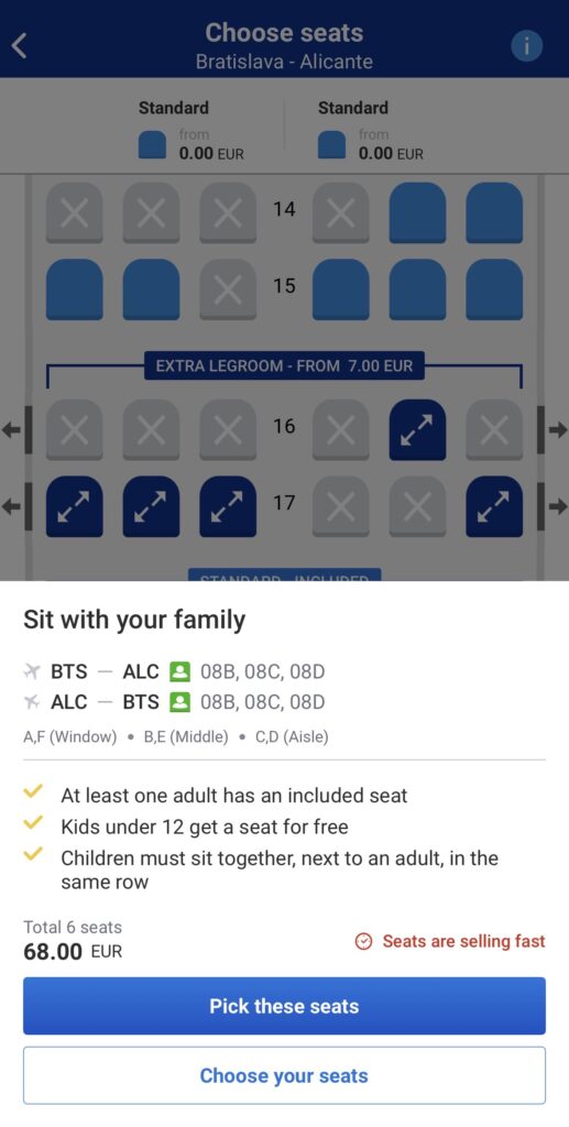 Zní to jako bizár, ale tohle mi poradili přímo na podpoře Ryanairu. Budou po vás chtít zaplatit těch 400 Kč (8 eur za jeden směr), ale budete si moct vybrat sedadla pro 1 dospělého a až 4 děti. I mimo zónu INCLUDED.